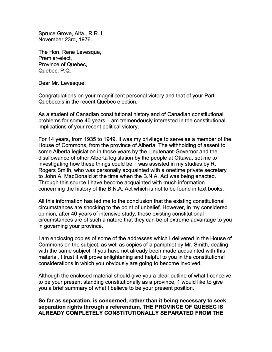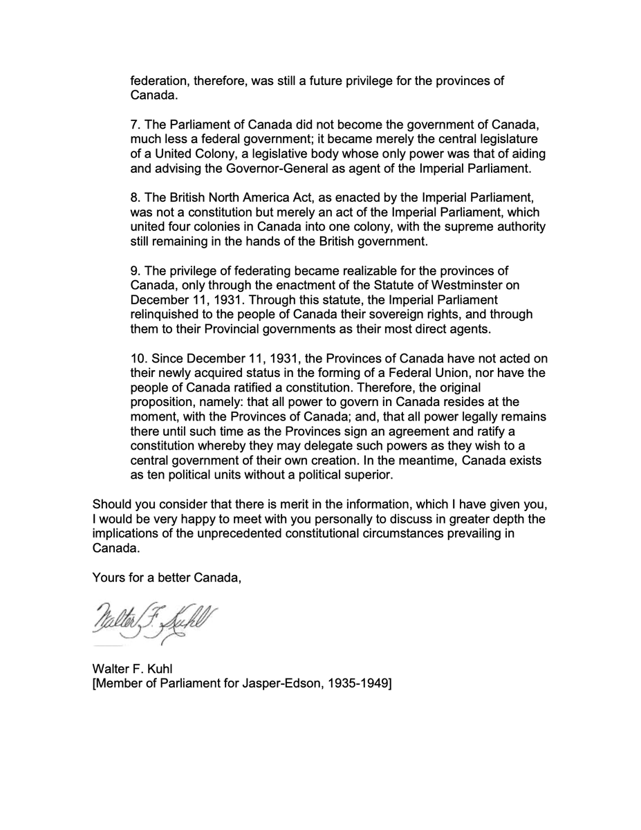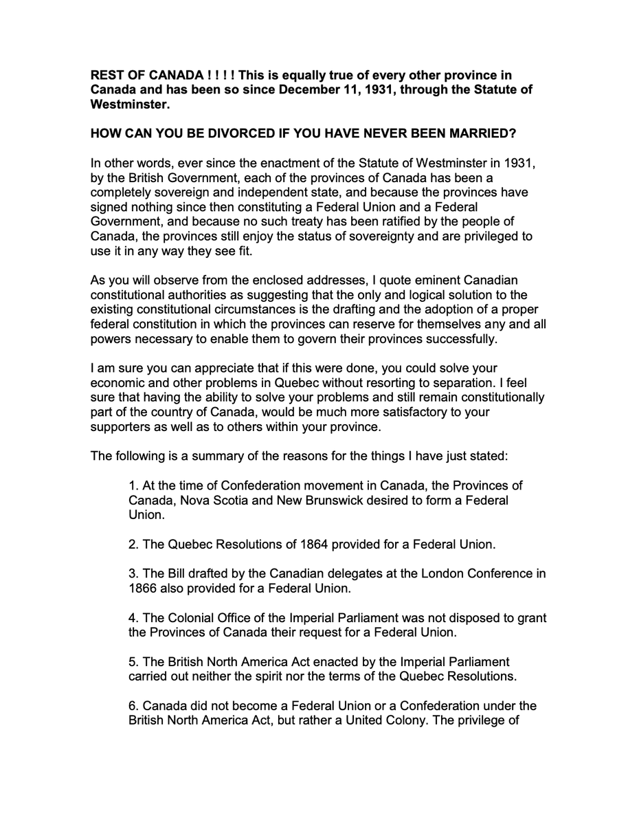 There is a lot more to say about the history of Canada, but if you want an easy read that summarizes where we are, read this letter from Canadian Parliament member Walter Kuhl that he wrote to Rene Levesque in 1976. It says it all.