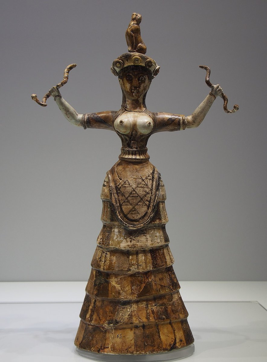 2/ Evans believed that he had discovered a Minoan palatial sanctuary with the two figurines, being made of faience, the larger of which represented a "Snake Goddess" and the smaller a priestess (he called her "Snake Priestess"), considering them to be votive objects.