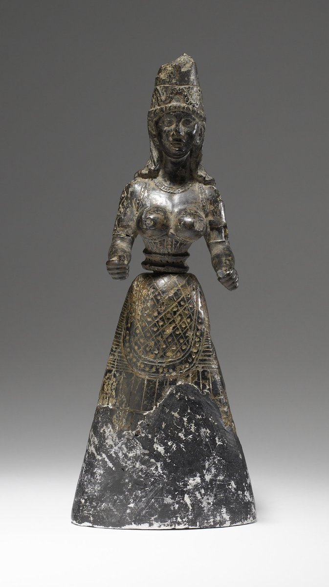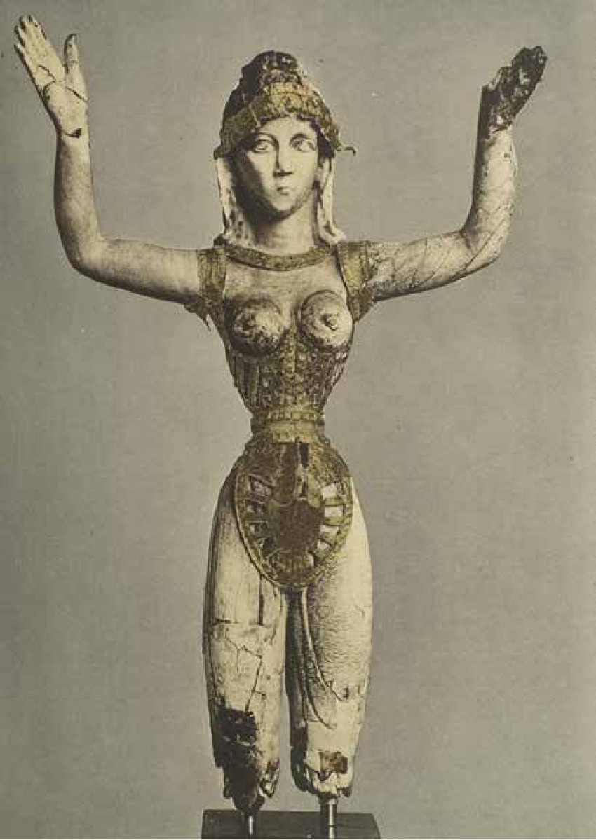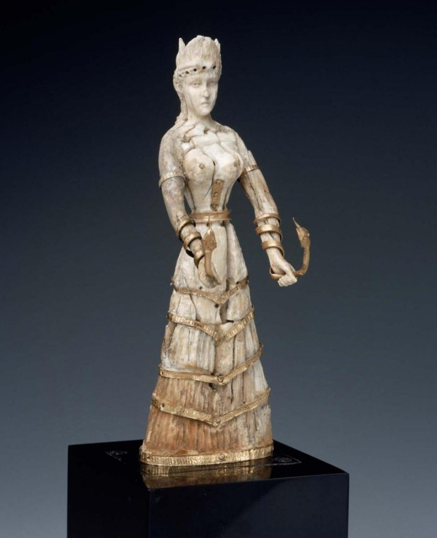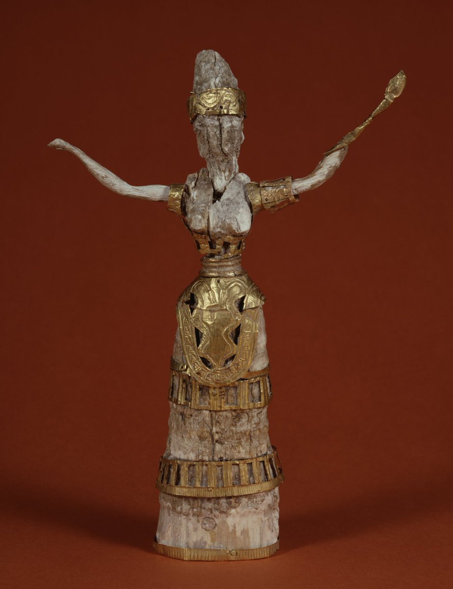 11/For example, the gold and ivory snake goddess acquired by the Museum of Fine Arts in Boston in 1914. The figurine arrived in the US in many fragments in a small tin, and was restored using wax and plaster because the right arm and part of the skirt were missing. The restored👉