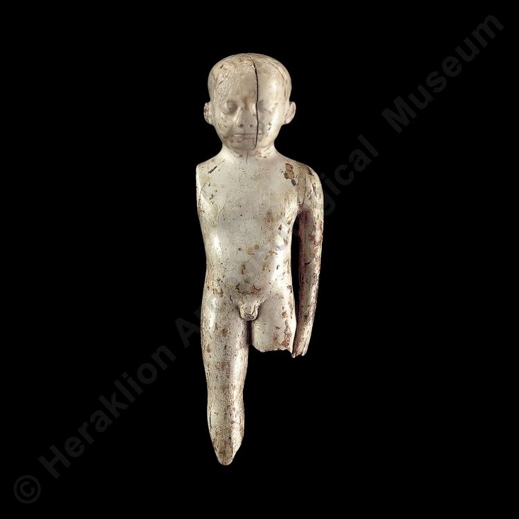 👉ivory figurines have been found at Knossos (male acrobat), at Palaikastro (ivory boys) and at Archanes. The famous Kouros, a 50 cm tall figurine of a young deity made from hippopotamus tusks,was found at Palaikastro. Evidence indicates the existence of a Neopalatial tradition👉