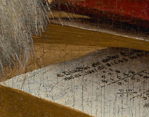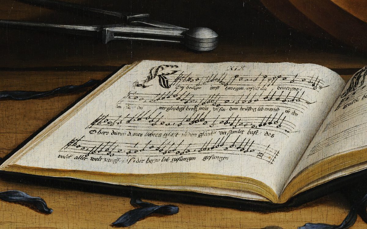 The items on the bottom of the table are an early clue to the picture’s meaning: the lute has a broken string; the flute case is missing a flute; there’s a set of dividers. Something isn’t right in the world. 6/