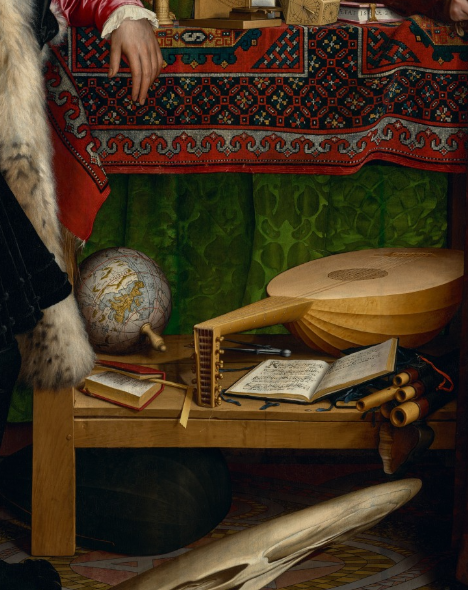 What do we see? Jean and Georges stand before a green curtain, on a patterned floor, beside a wooden table. On the top of the table are astronomical tools, guides to the heavens. Beneath are more earthly items; a lute, a globe, two books. 4/