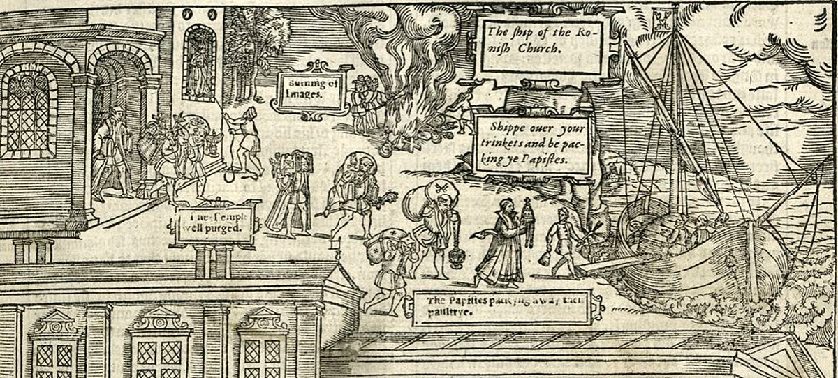 Which meant that altars were no longer holy places where miracles occurred. So reformers replaced altars with wooden communion tables. As we see here from ‘The Temple well purged’ page in Foxe’s Book of Martyrs. 18/