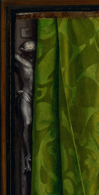 But Holbein’s move to London coincided with reformers like Anne Boleyn and Thomas Cranmer arguing for the destruction of religious art. Cranmer even wanted to burn crucifixes, like the one Holbein shows peeping out from behind the green curtain. 24/