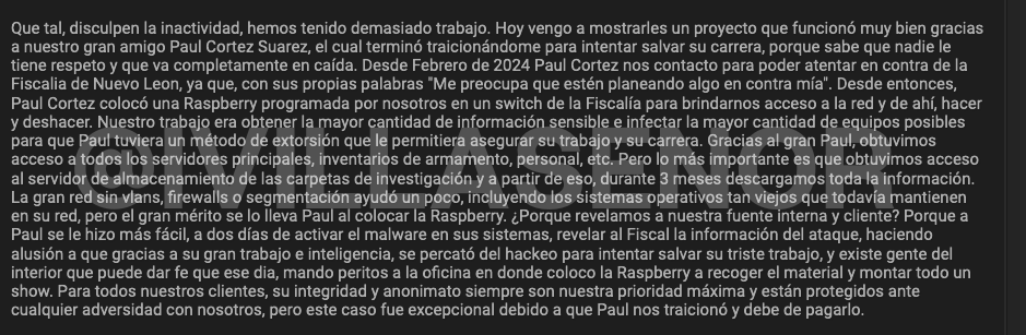 El hacker Scorpion —el mismo que hackeó el C5i de Hidalgo— señaló en una publicación de la dark web que el trato era que instalaría una Raspberry Pi en la Fiscalía para infiltrarse en la red interna. El objetivo: obtener toda la información posible para que Paul tuviera una "carta bajo la manga" contra sus superiores en caso de que atentaran contra él.