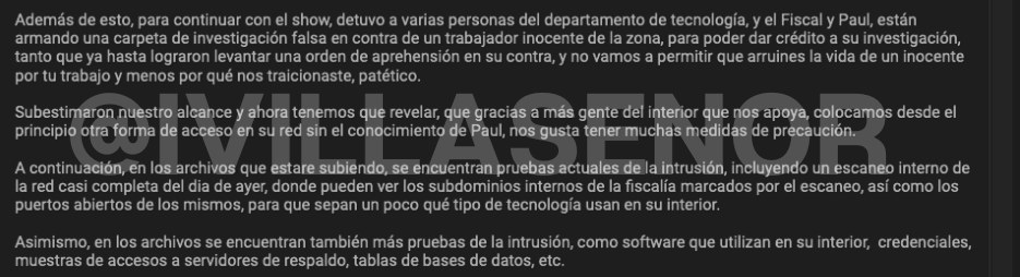 Scorpion señala que Cortez detuvo a varias personas del departamento de tecnología y están armando una carpeta de investigación falsa en contra de un trabajador inocente para poder dar crédito a su investigación, asegura que ya hay una orden de aprehensión en su contra.