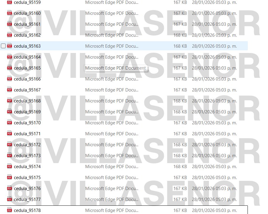 Aunque la metadata indica que la base total tiene 95,178 cédulas, el archivo filtrado muestra 55,378 archivos en PDF. Uno por cada agente.