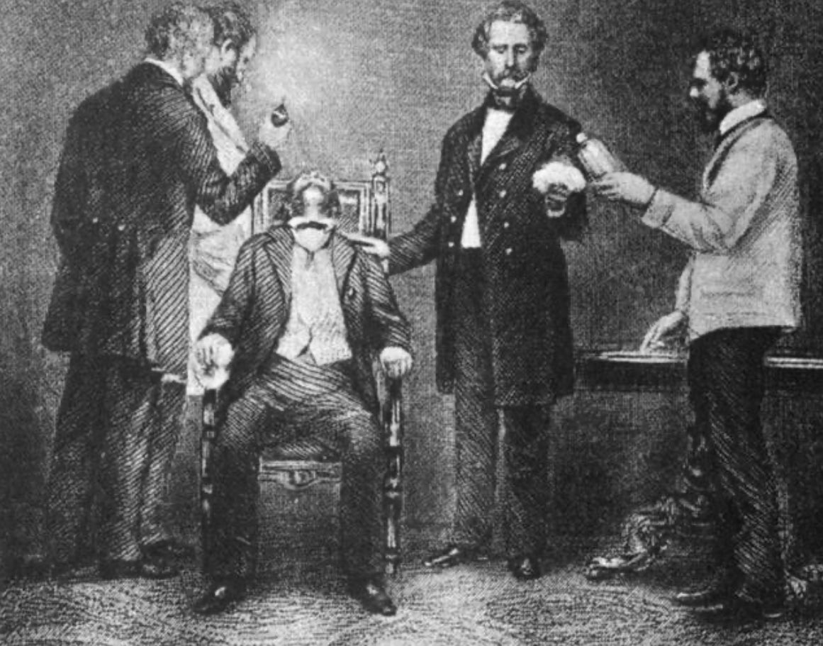 On considère souvent que l’anesthésie est née dans les années 1830-40 en Occident lorsqu’on a commencé à utiliser le protoxyde d’azote (ou gaz hilarant) et l’éther lors de chirurgie afin de diminuer les douleurs des patients.