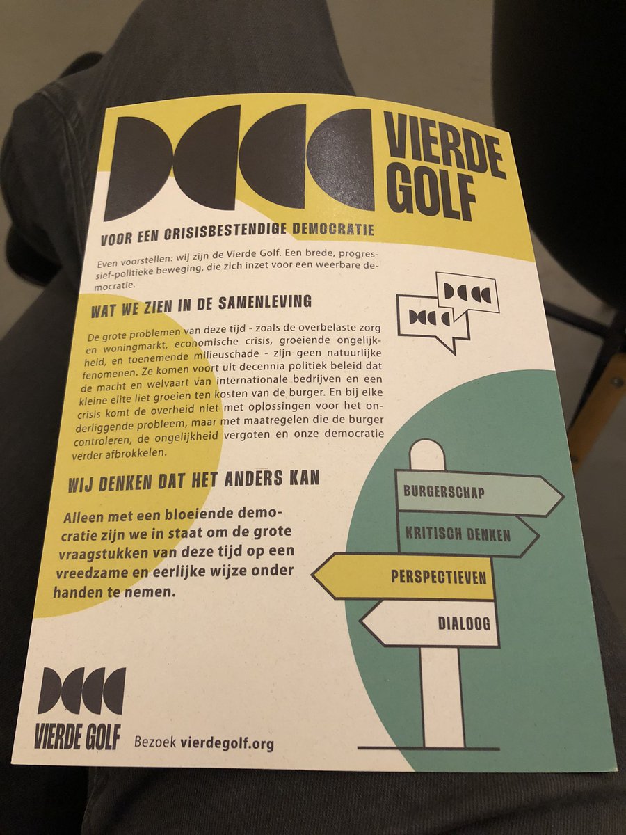 Vrouw leidt de boel in. Ze is blij met de opkomst [man of veertig, denk ik]. Ze vertelt dat de Vierde Golf voor een crisisbestendige democratie is. Daarom zijn ze in gesprek en ontmoeten ze elkaar. Daarom zijn we hier. Donaties zijn hier facultatief vanwege de kosten.
