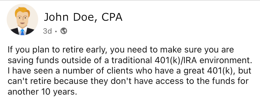 I agree with him that if you plan to retire early, you need to have funds outside your 401(k)/IRA accounts.