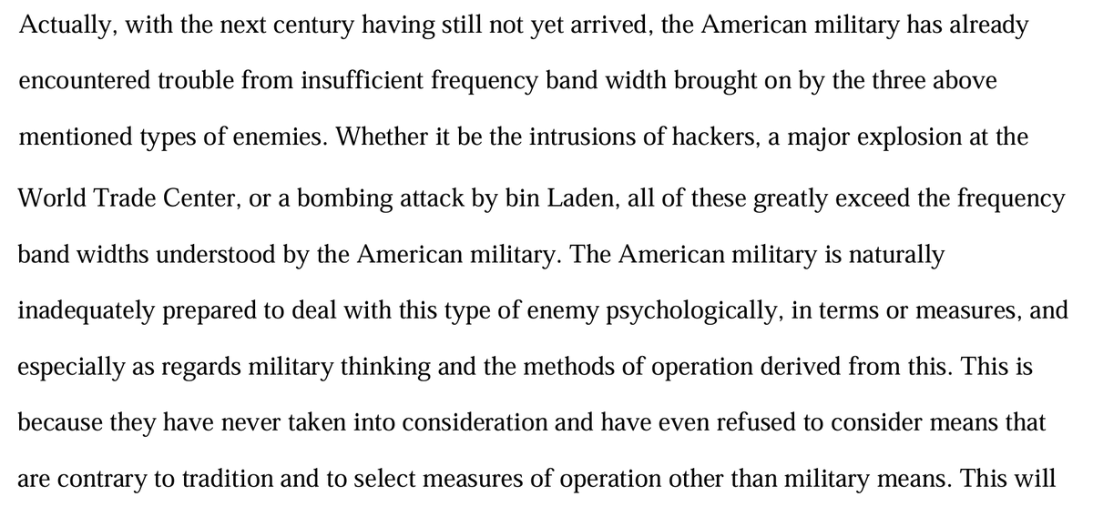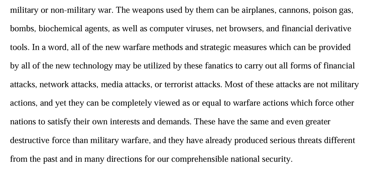 In 1999, the PLA published a book by two senior Airforce colonels. The title translates as "war without bounds", or "Unrestricted Warfare". The authors recognize the technical superiority of the US military, and propose a hybrid style of warfare using unconventional tactics.