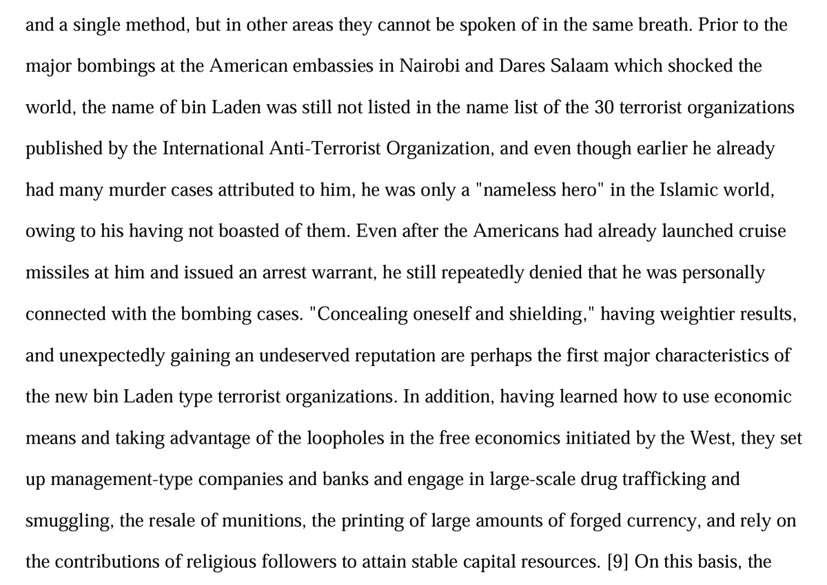 They note the way Bin Laden finances operations through a network of shelf companies and registered charities, which operate legally even in western countries, funneling money from drug trafficking, arms reselling, counterfeiting, along with donations from religious followers.