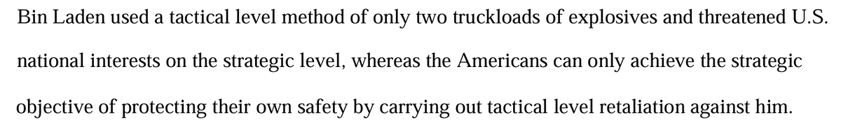 They admire Bin Laden for wrecking US strategy in Africa with his destruction of US embassies in Kenya and Tanzania - using a simple truck bomb. They also highlight his evasion of attribution. While other terrorists boast of their kills, Bin Laden denies all responsibility.