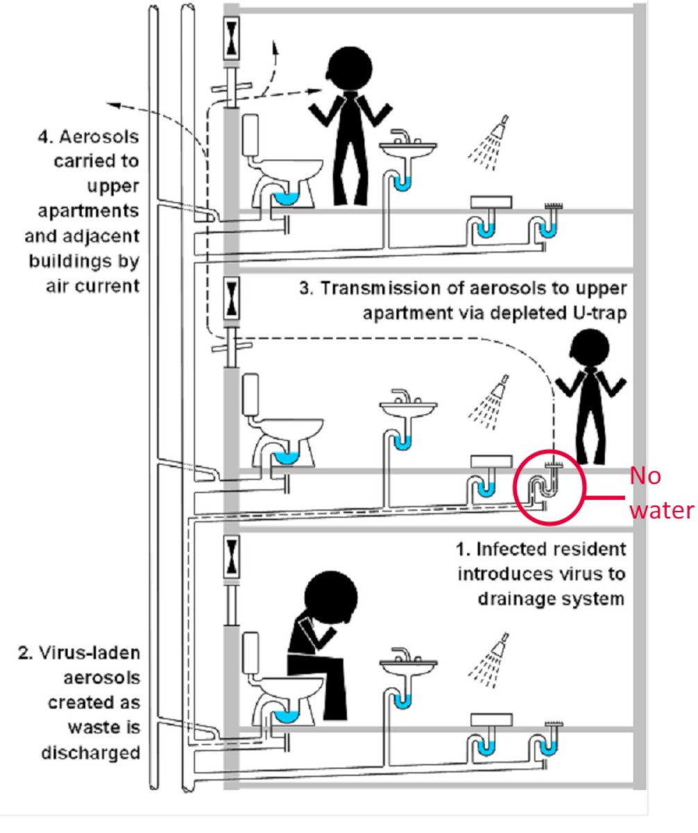 They determined that the cause was that the index case (a visitor, not resident) had diarrhea. Because of a dry U-trap in the unit above, aerosols generated by flushing the toilet found their way upstairs and to other units above.