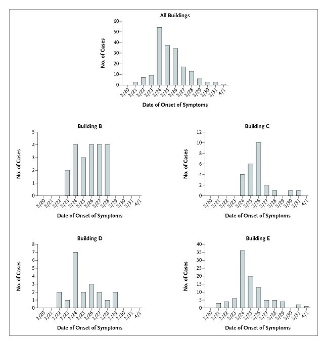 The WHO claimed the cases in other towers were secondary, but a later paper disputed this. The date of symptoms onset is too close together. If there is any lag in the other towers it is likely due to lower exposure and viral load. They were all infected at the same time.