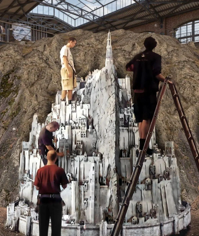 Minas Tirith – the capital of Gondor – is the setting for much of the film. It was created via a combination of sets and miniatures. The top level was a set, and the winding streets of the city were an intricate maze built in a quarry.