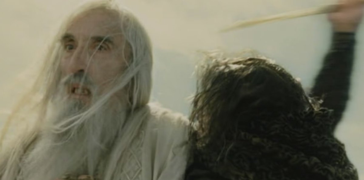 Saruman meets his end during the first act when he is literally stabbed in the back by Wormtongue. Jackson later said that when he tried to direct Christopher Lee, he was told by Lee (who served in World War II) that he knew what a man being stabbed sounded like.