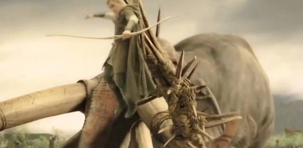 The sequence of Legolas leaping onto the Oliphaunt was filmed in a single day, with Orlando Bloom on a blue-screen rig designed to look like the creature's back. And the carcass we see afterwards was the largest prop ever created for a movie, and made by Weta Workshop.