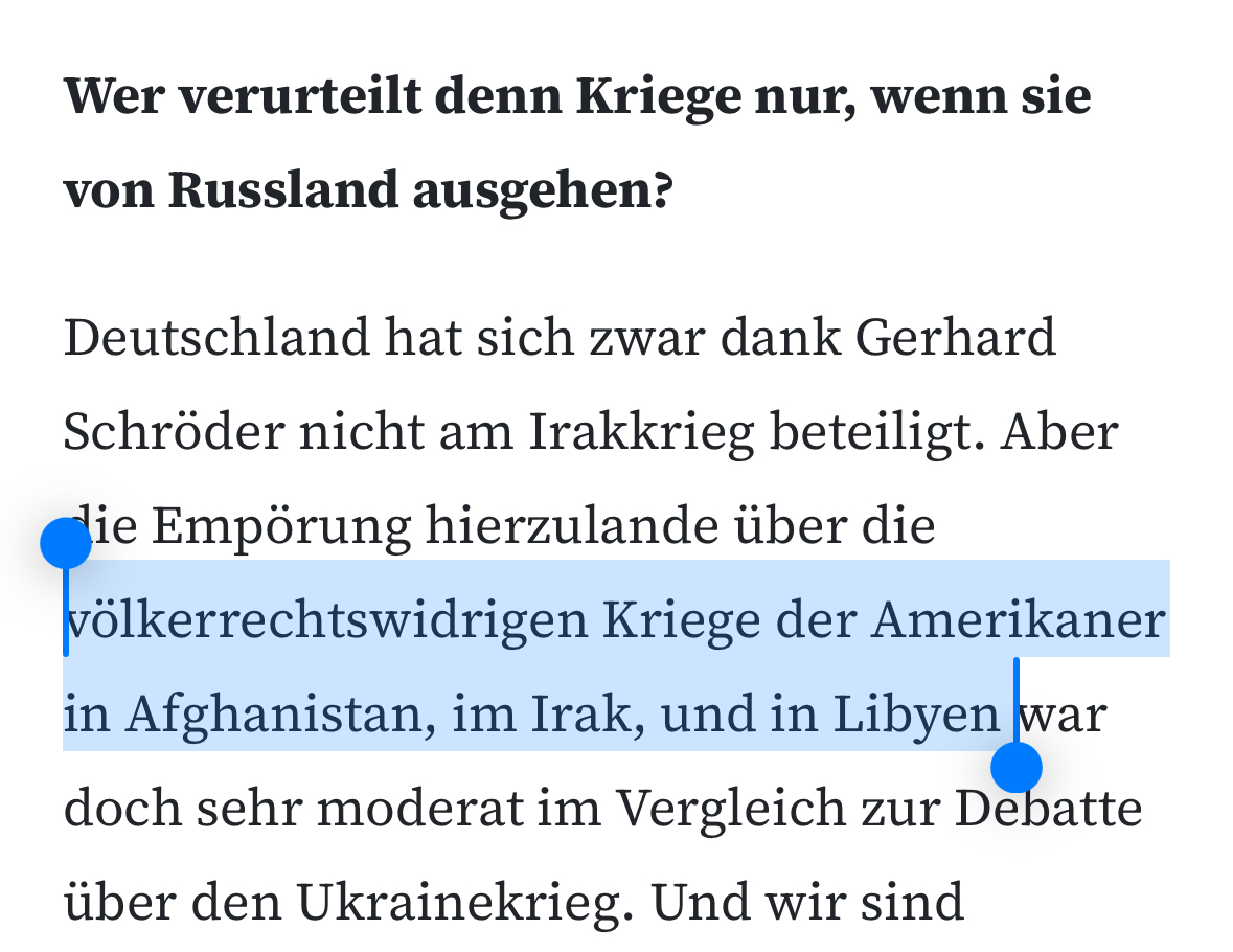 Nebenbei erklärt Wagenknecht dann auch den Krieg in Afghanistan und in Libyen zu völkerrechtswidrigen Kriegen - obwohl beide Interventionen mit Mandaten des UN-Sicherheitsrates durchgeführt wurden. In Libyen waren es zudem FR und GB, die vorgeprescht sind, nicht die USA. 3/