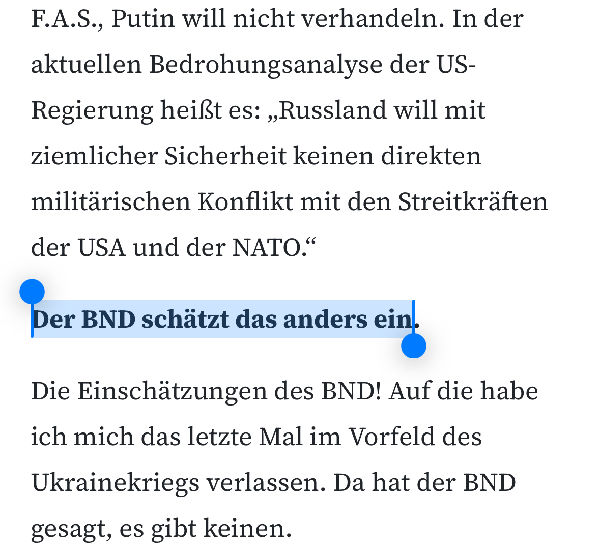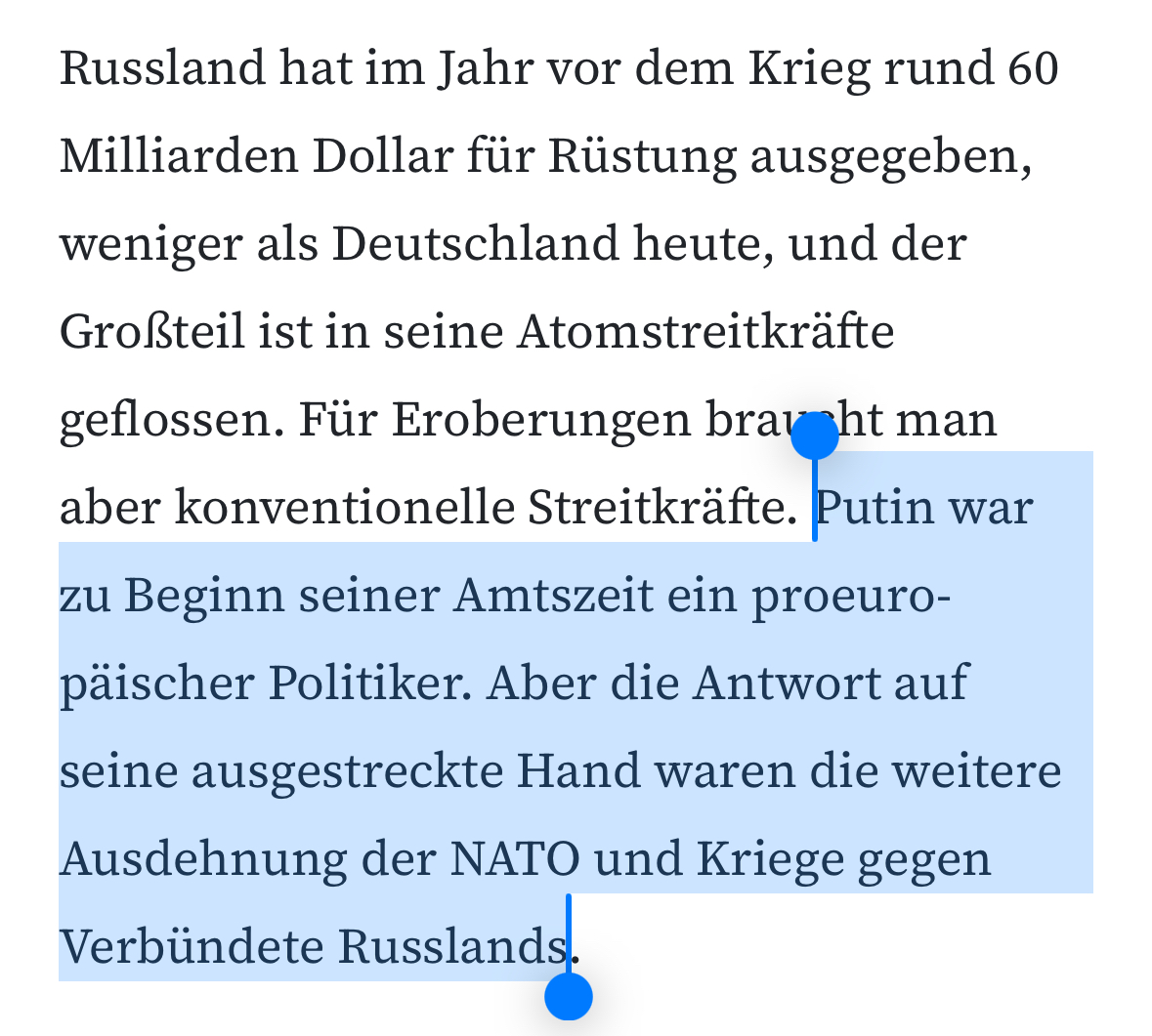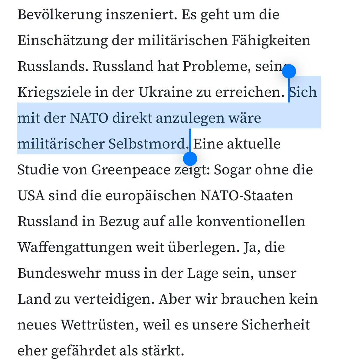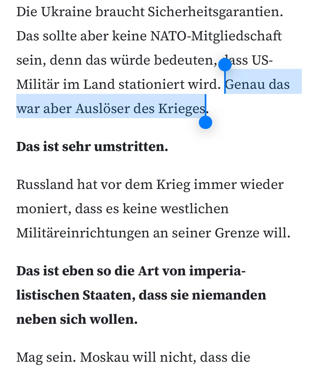 An anderer Stelle suggeriert Wagenknecht, die bloße *Aussicht* auf die Stationierung von US-Truppen habe Putin zum Angriff bewegt. Das ist nicht "umstritten", sondern ignoriert die NATO-Russland-Grundakte, die nennenswerte Stationierungen östlich der Elbe ausschließt.