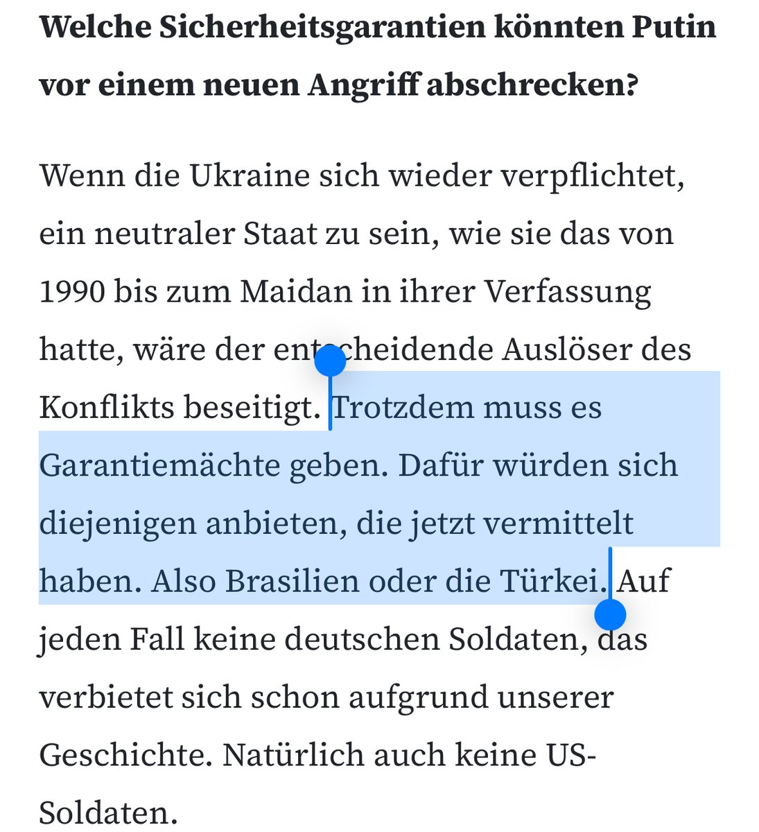 Ein besonders krasser Widerspruch in Wagenknechts Argumentation ist der Vorschlag, die Türkei solle die Sicherheit der UA garantieren. Würde die Türkei von RU angegriffen, weil sie ihr bei einer weiteren Invasion militärisch beiseite steht, wäre das Art.5. 11/