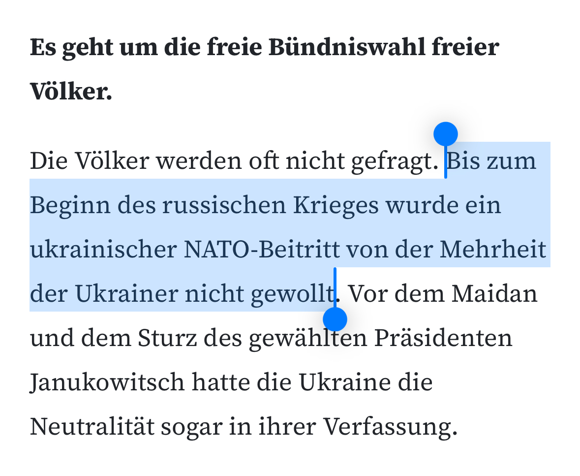 Stattdessen ergeht sich Wagenknecht im Geraune, dass Länder gegen ihren Willen in die NATO gezwungen würden. Aus Versehen spricht sie auch hier eine Wahrheit aus: Die Ukrainer:innen wollten mehrheitlich nicht in die NATO - bis zur Großinvasion. Seitdem schon. 13/