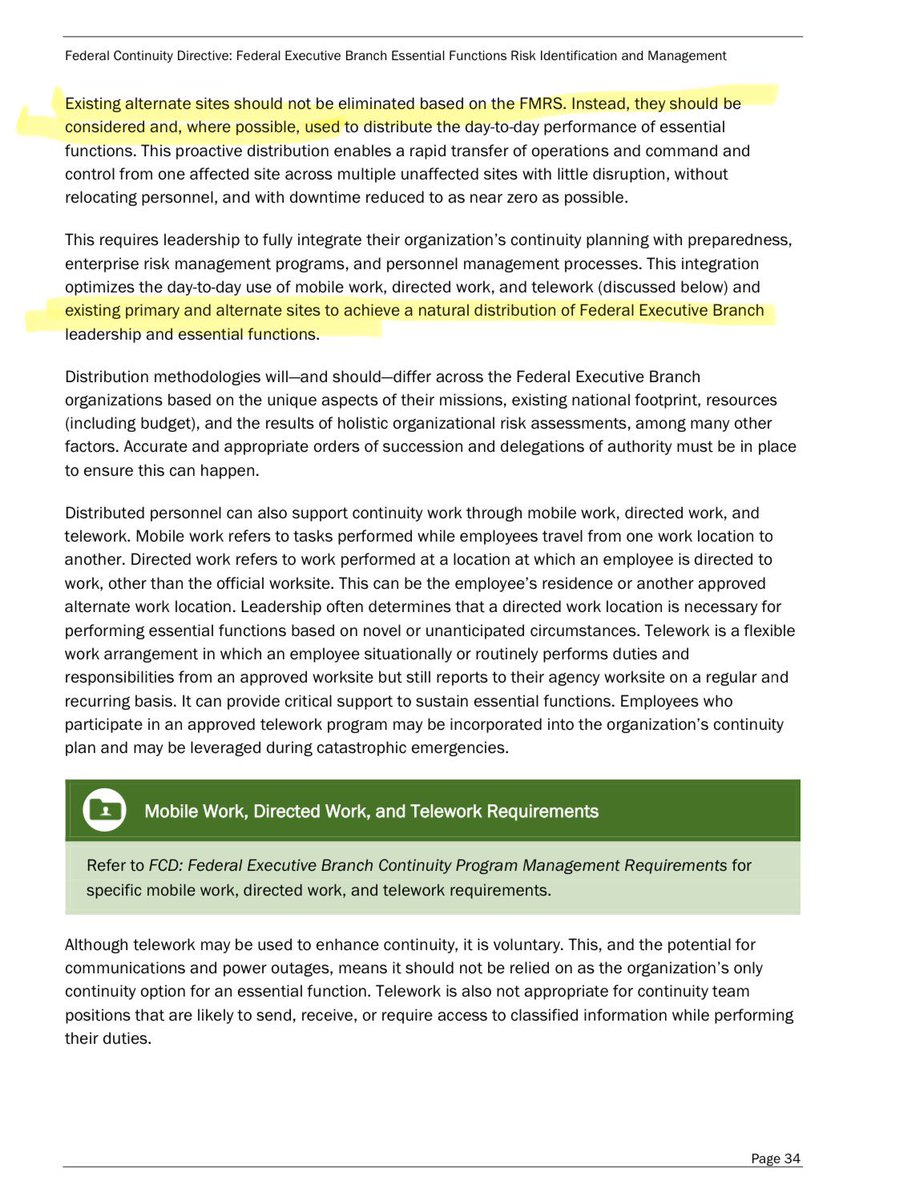 Based in the FMRS (Fed’l Mission Resilience Strategy) alternate (devolution) sites are encouraged to be USED when possible for day to day essential function operations.