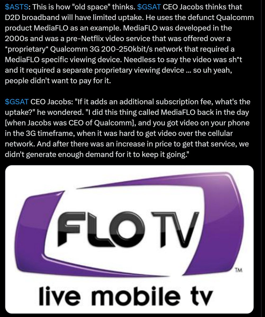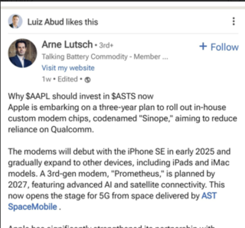 This is a fun LinkedIn like by Luiz (our sales guy). But it also speaks to the issue of how people do not want to be captive to QCOM. If the high end QCOM chips are needed by others for satellite connectivity, then $ASTS is all the more valuable to hand set providers