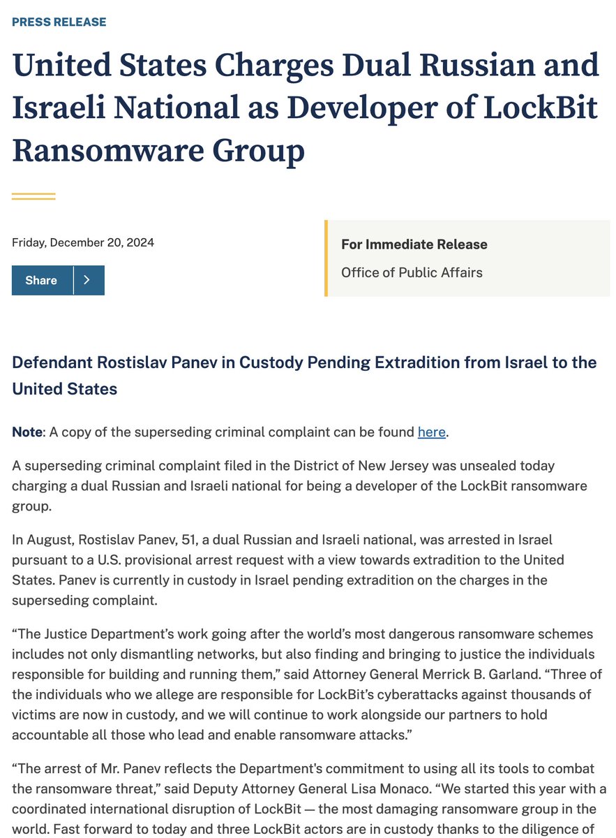 On Friday, December 20, 2024, the U.S. DOJ charged Rostislav Panev, a dual Russian-Israeli national, as a LockBit ransomware developer. Arrested in Israel, he awaits extradition to the U.S.