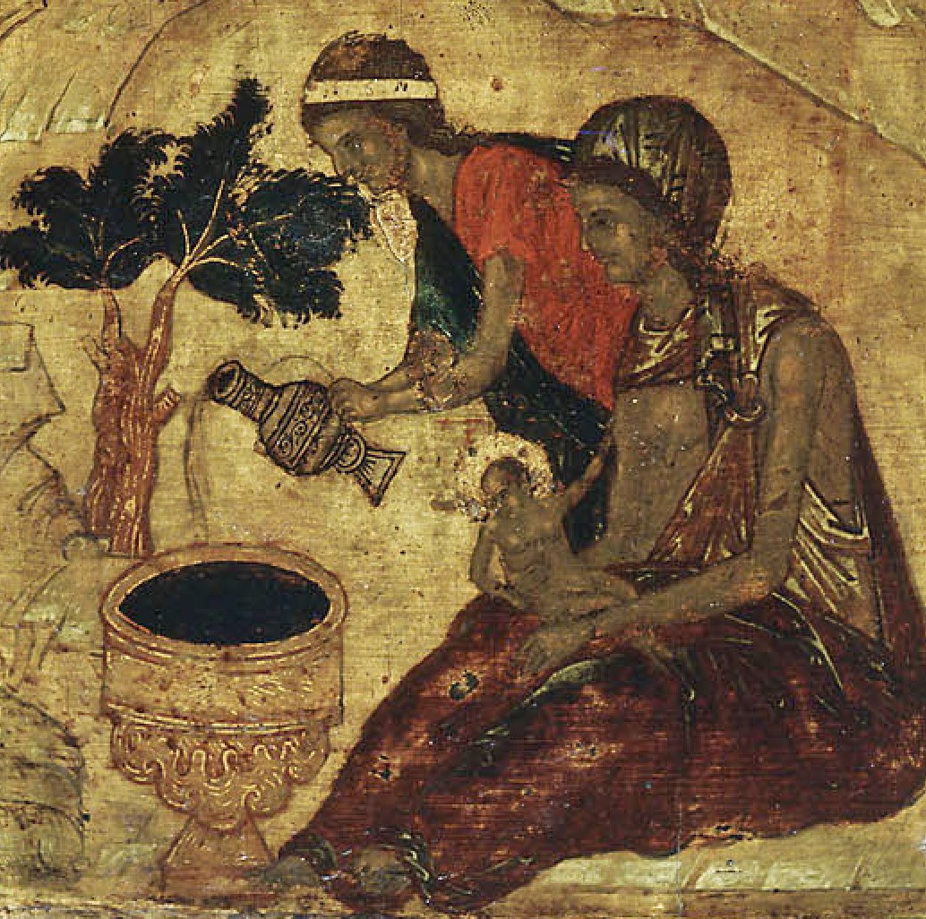 Y en el centro de la composición: María. Pese a su gran tamaño respecto al resto de personajes y a su posición central, Rublev consigue no hacer de ella la protagonista del icono. Y es que María, por muy grande que sea su figura, no es la autora de la redención, sino su hijo.