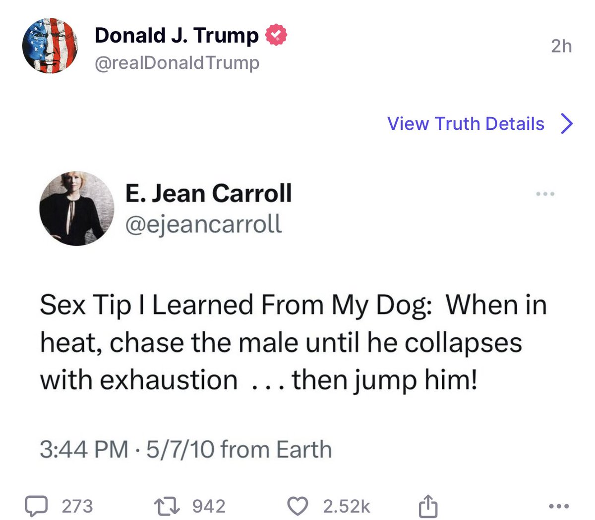 President Trump has just Truth-bombed out about 20 posts showing how E. Jean Carroll is a sex-crazed lunatic who was obsessed with Roger Ailes and a massive Apprentice fan. I might as well share them all with you here.