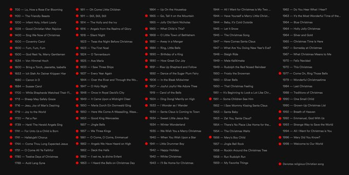 🧵7/ Here's a chronological list of many Christmas song favorites. The red dot indicates religious/Christ-centered songs.
