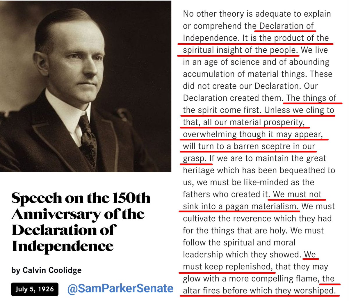 🧵10/ At about the same time that jews were starting to preach this materialistic American Dream, President Calvin Coolidge explained in his speech on the 150th Anniversary of the Declaration of Independence what the true American Dream was: