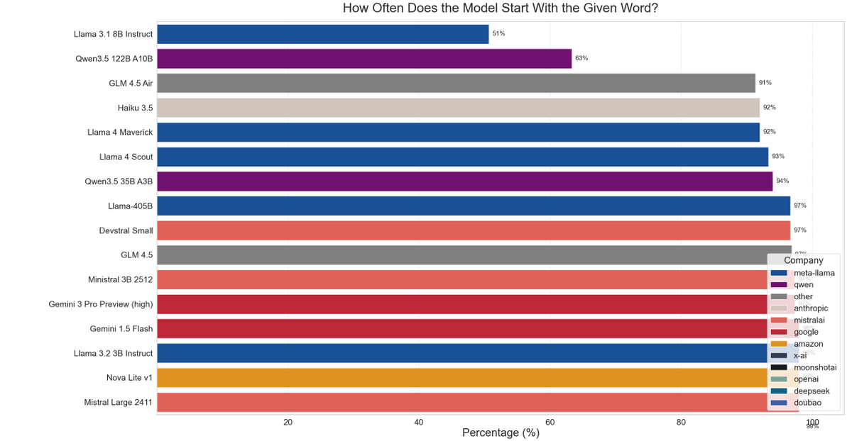 Usually all models should start their raw response with the starting word that was given to them. Like everything below 97% on this chart is kinda sus.