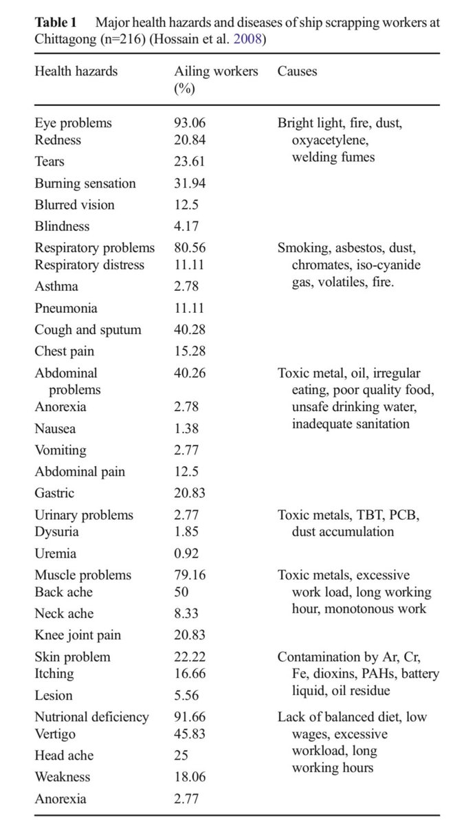Shipbreaking is one of the world's most dangerous jobs. As well as high mortality rates and brutal conditions in some yards, chronic issues persist: A 2008 study on Chittagong scrappers showed 80%-90% with eye or respiratory problems from powders, fumes, asbestos and toxins.