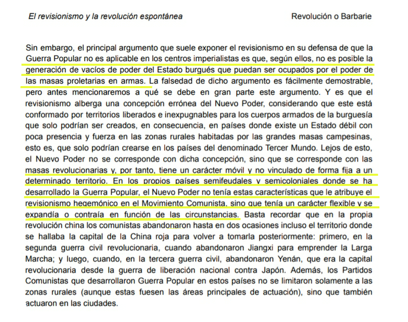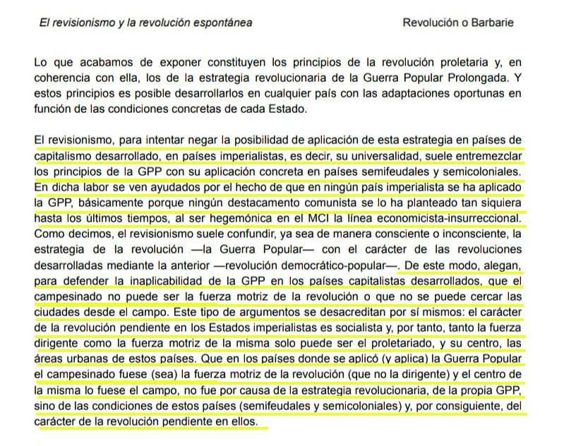 Quiero rescatar estos párrafos de "El revisionismo y la revolución espontánea" en los que se combaten los lugares comunes y argumentaciones -propias del revisionismo y de la derecha del mapísmo- sobre la supuesta no aplicabilidad de la Guerra Popular en el centro imperialista Image