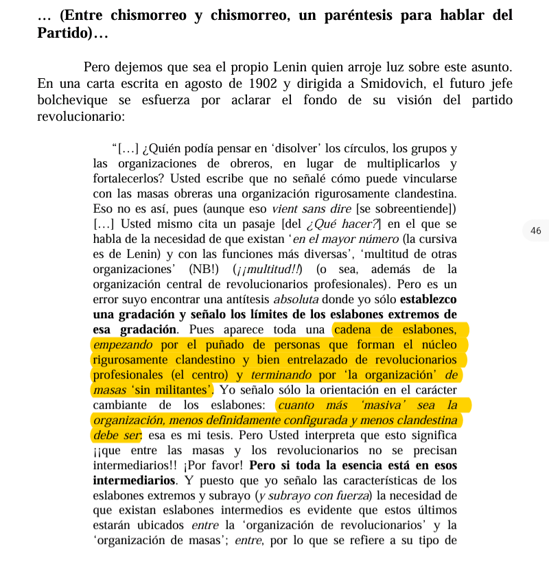 De acuerdo con Lenin, el partido revolucionario de nuevo tipo es una "cadena de eslabones" entre la vanguardia (cuyo aparato es clandestino) y el movimiento de masas revolucionarizado. El revolucionario profesional es quien media entre cada eslabón. Image