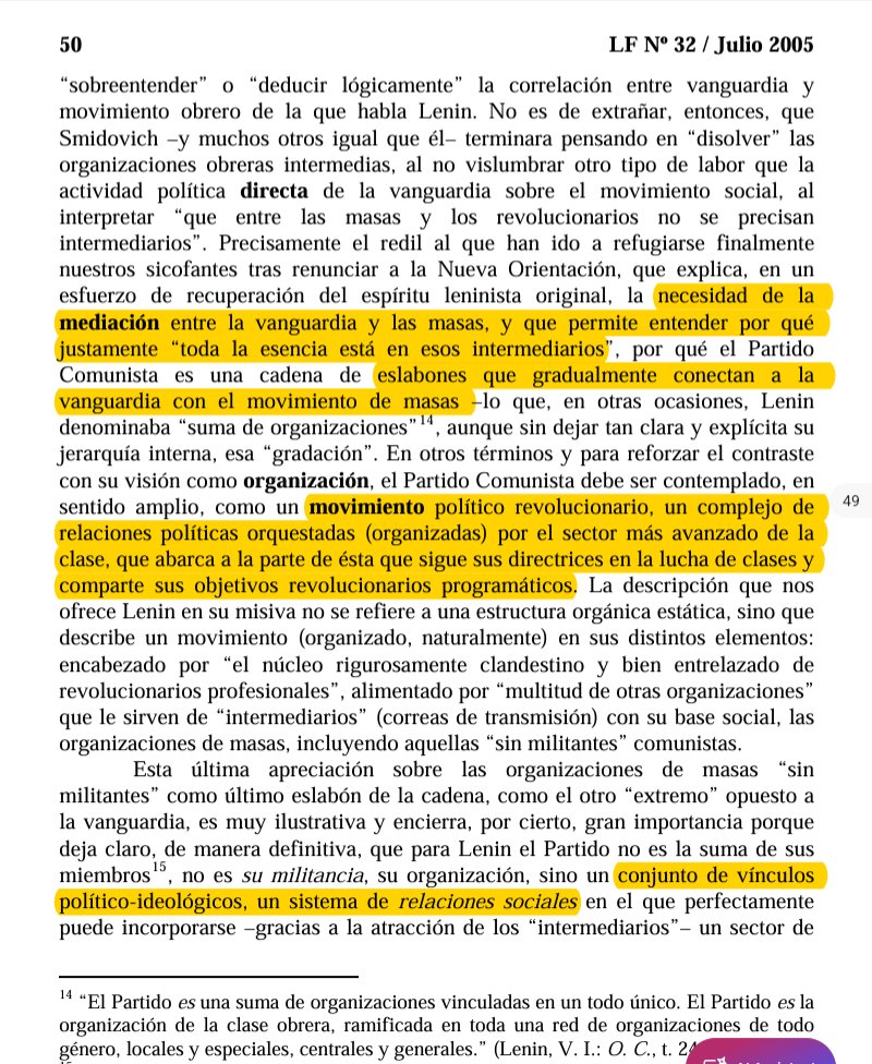 Estas ideas leninianas, cuyo legado recoge la LR, no implican desechar o renunciar a elaborar una línea de masas, sino llevar a cabo la fusión con la vanguardia práctica y la conquista de las masas una vez (re)constituída (1o desde fuera) la vanguardia ideológica y política.