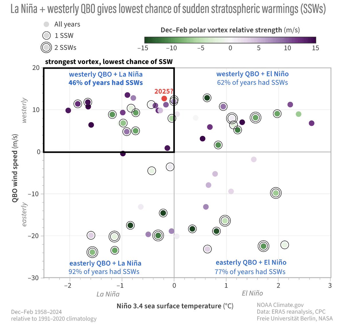 Statisticamente, in anni con QBO+ come questo il VPS risulta in genere più compatto e meno incline a fenomeni di SSW (effetto dinamico Holton-Tan) ↙️, soprattutto quando è presente la Nina (SSW solo in 12 casi su 26). (6/9)
