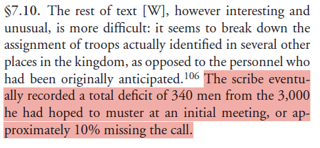 "The scribe eventually recorded a total defi cit of 340 men from the 3,000 he had hoped to muster at an initial meeting, or approximately 10% missing the call."