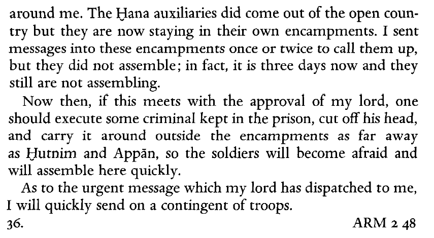 4." to encourage the others" - letter from a military commander to the king of Mari.