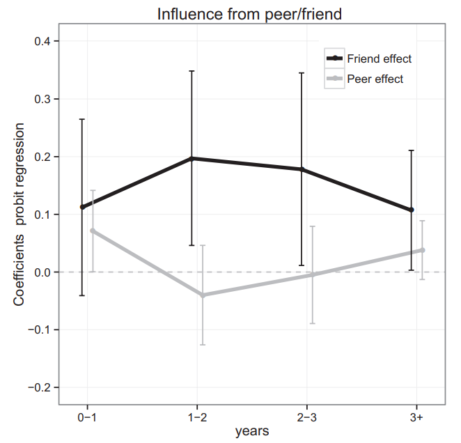 Important to note how friendship and peer status are measured, many of the peers are not everyday acquaintances but previous peers from school, possibly a study looking at the peer-effect of current-day acquaintances would show an effect.
