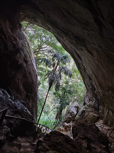 set of narrow stairs cut into the rock go up to the mouth of the cave where Ravana hid Maa Sita next.
