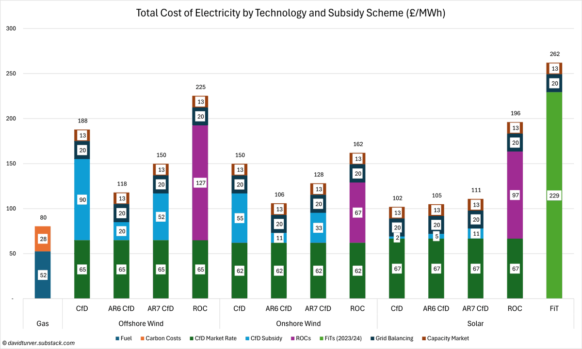 We subsidise solar in 3 ways. The basic cost of solar from feed-in-tariffs is £229/MWh for 2024/25. To that we must add £33/MWh for grid balancing and backup costs, giving a total of £282/MWh, or >3X gas-fired electricity including carbon costs (3/n)