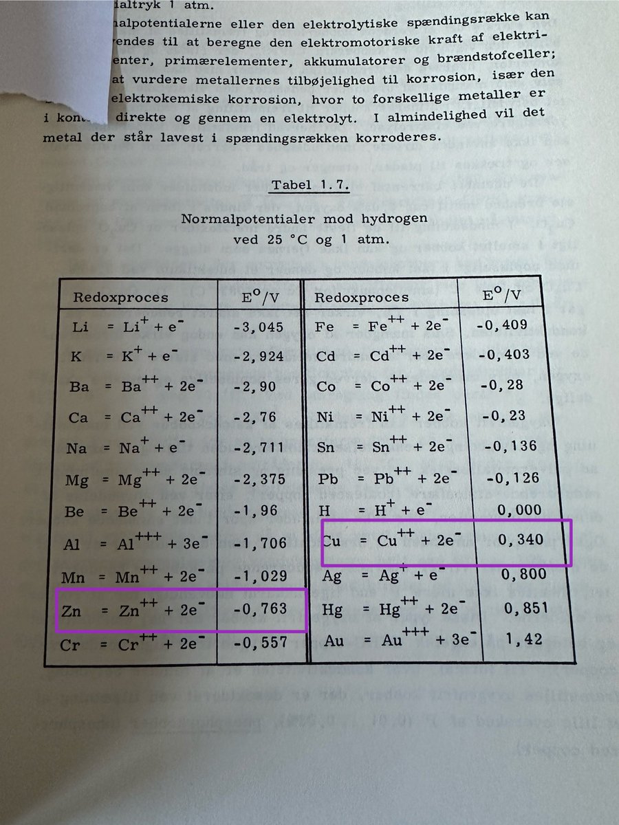 Vi skal have fat i min gamle materialelærebog fra ingeniørstudiet og her finder vi en tabel med ‘spændingsrækken’. Man kan se, at mellem kobber og zink, kan der opstå en spændingsforskel på godt 1V.