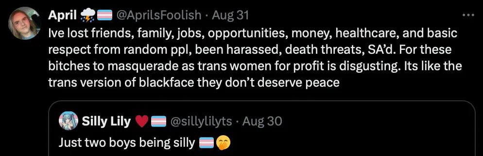 April was VERY upset. He said that these women ‘masquerading as tr&ns women’ for profit was ‘disgusting’. He even went as far as comparing it to blackface! Well, I think that April would be very shocked to find out that women have been comparing men wearing dresses to blackface for a long time. But don’t let us get in the way of that complete lack of self awareness, ‘April’.