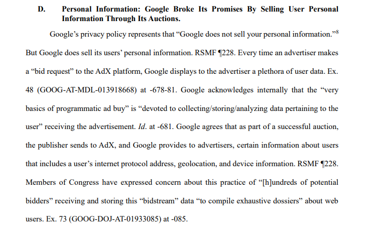 We still expect the US v Google decision in the parallel trial here in Virginia any day now but it's good to continue to see user data and surveillance capitalism play such a large role in the Texas lawsuit. Here is Texas describing how it alleges Google broke its promises. /7