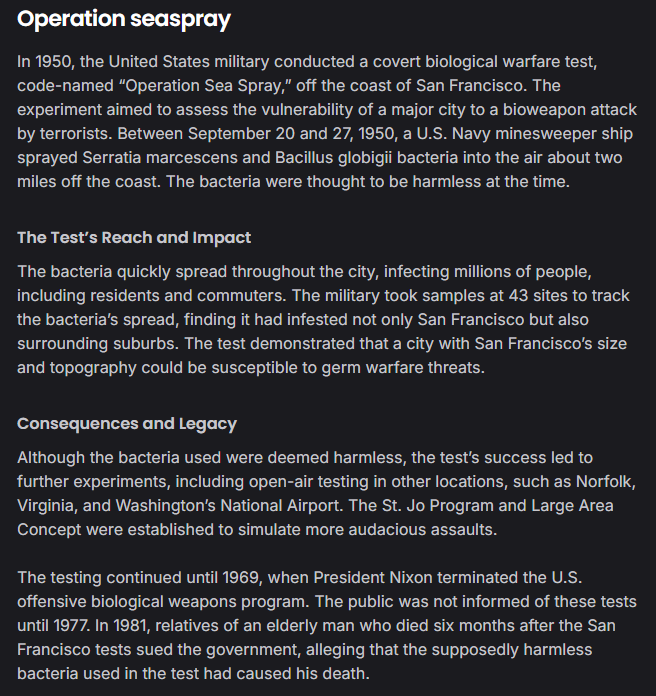 OPERATION SEASPRAY - hydrophillic, bacteria infused particulates essentially behaving like a fog to spread disease.