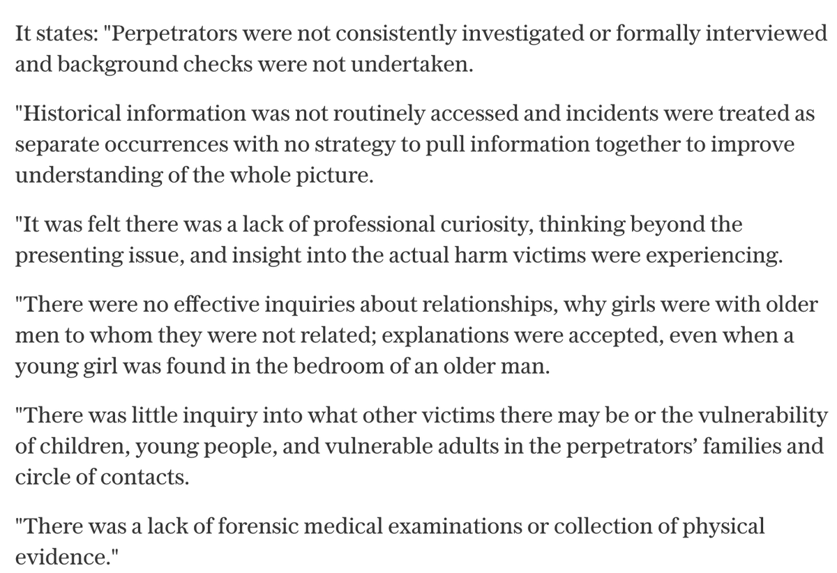 Second, and perhaps even more damning, was the vast wall of silence surrounding it. Police, local authorities, politicians, NGOs, social services - many were either indifferent to this industrial-scale child rape or, worse, actively complicit in covering it up. It was a collective betrayal of a scale I’ve never encountered in my adult life.