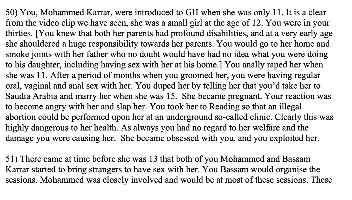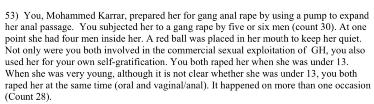 This basically allowed animals like Mohammed and Bassam Karrar to subject their child victims to a string of violent and sadistic rapes, often leaving them injured. After grooming them for about a year, they took them to other places around the county to be sold and raped in hotels and "brothels for young girls". Other men paid them to play out sadistic sexual fantasies.